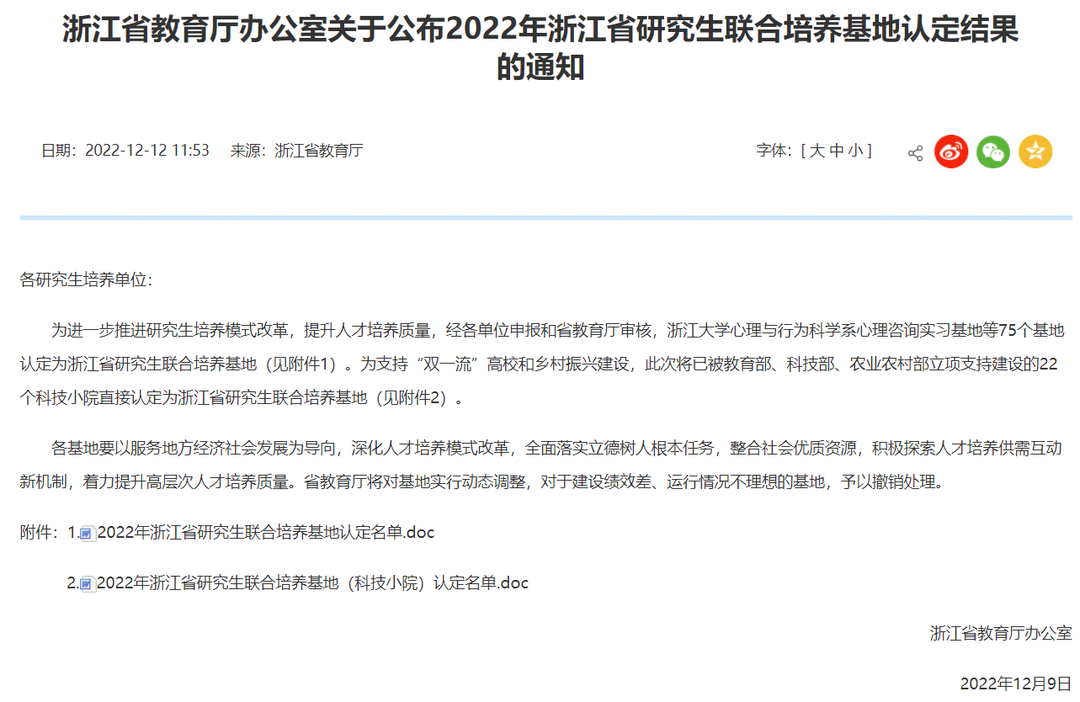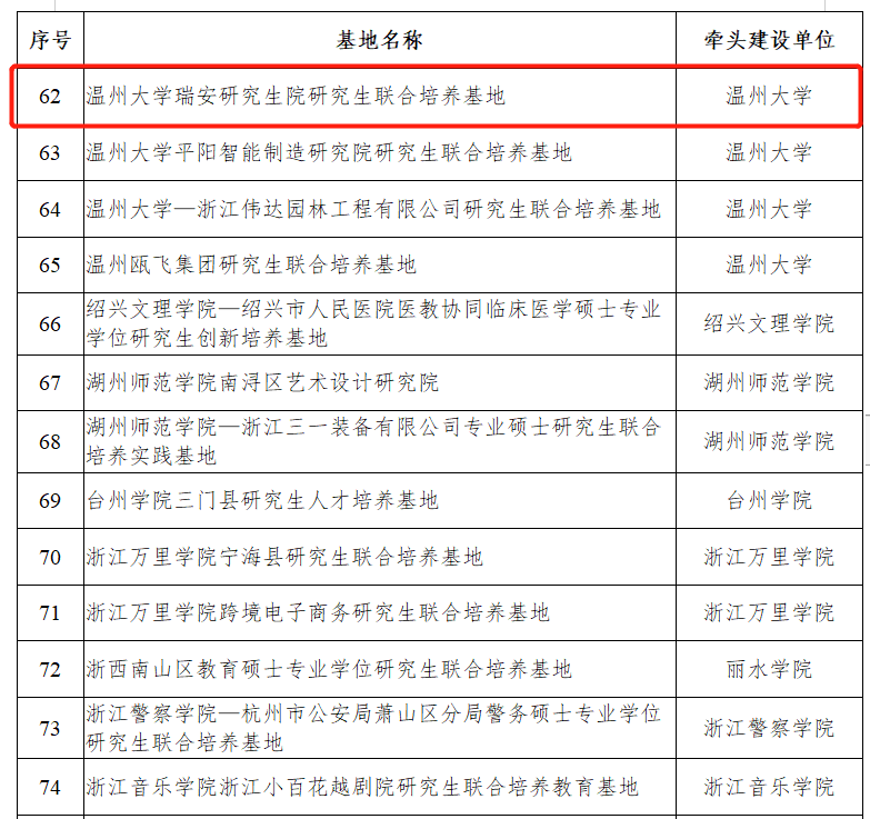 为进一步推进研究生培养模式改革,提升人才培养质量,省教育厅发布《关于公布2022年浙江省研究生联合培养基地认定结果的通知》,经各单位申报和省教育厅审核,认定温州大学瑞安研究生院等75个基地为浙江省研究生联合培养基地。