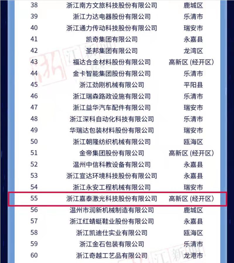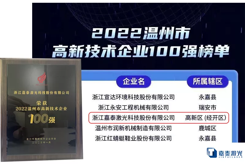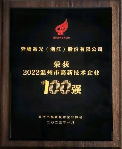 据介绍,该榜单依托温州市高新技术企业协会,通过对企业发明专利、研发经费、主营业务收入等多指标的综合比对,评选出发布2022年温州市高新技术企业百100强榜单。“百强榜单”涵盖智能装备、新能源、新材料、激光等高新技术产业领域。温州市激光行业协会会长单位奔腾激光(浙江)股份有限公司、副会长单位浙江嘉泰激光科技股份有限公司位列其中。