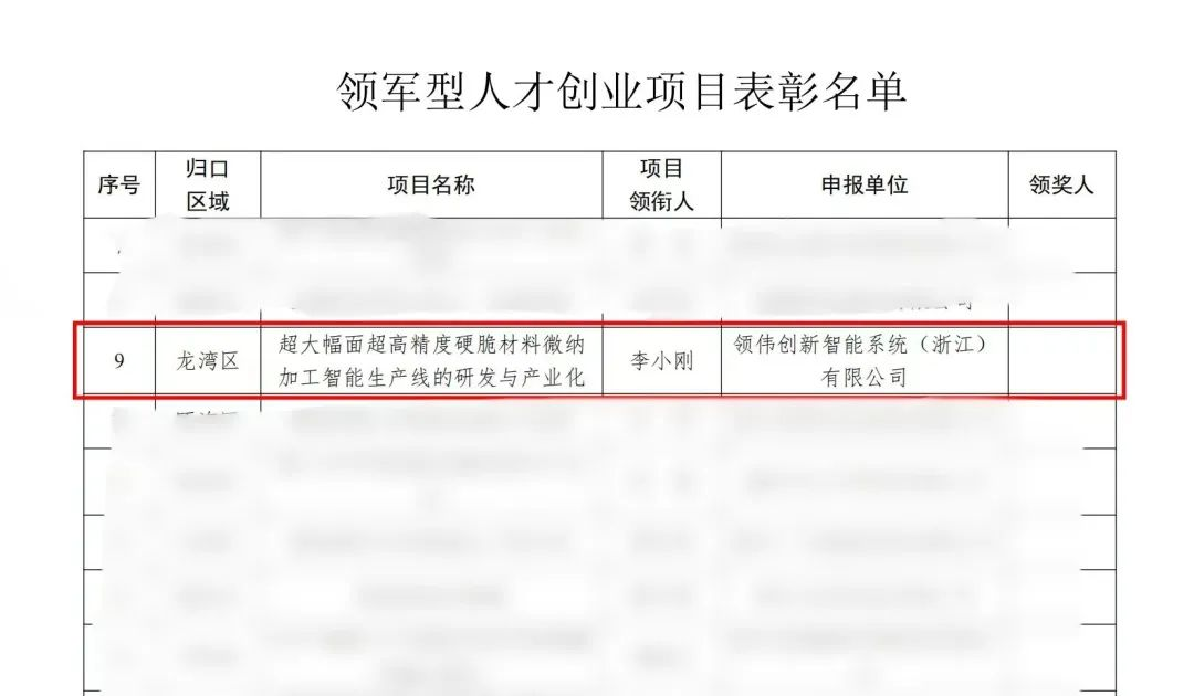 1月3日上午,市委人才和科技创新工作会议暨市域一体化创新体系建设动员大会在温州市人民大会堂召开。由协会会员单位领伟创新智能系统(浙江)有限公司常务副总李小刚领衔研制的超大幅面超高精度硬脆材料微纳加工智能生产线的研发与产业化项目荣获温州市领军型人才创业项目表彰。