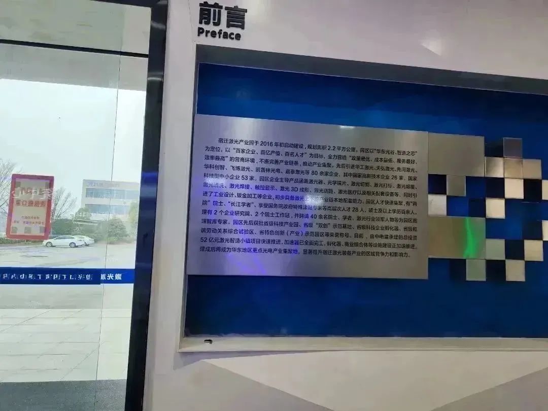 宿迁激光产业园是宿迁八大先进特色产业园区之一,总规划面积2.2平方公里。2016年初启动建设以来,先后集聚了华工激光、天弘激光、先河激光、汇能激光等近90余个项目,产品涵盖激光元器件及切割、焊接、熔覆、清洗、打标及医疗和家用激光设备等。