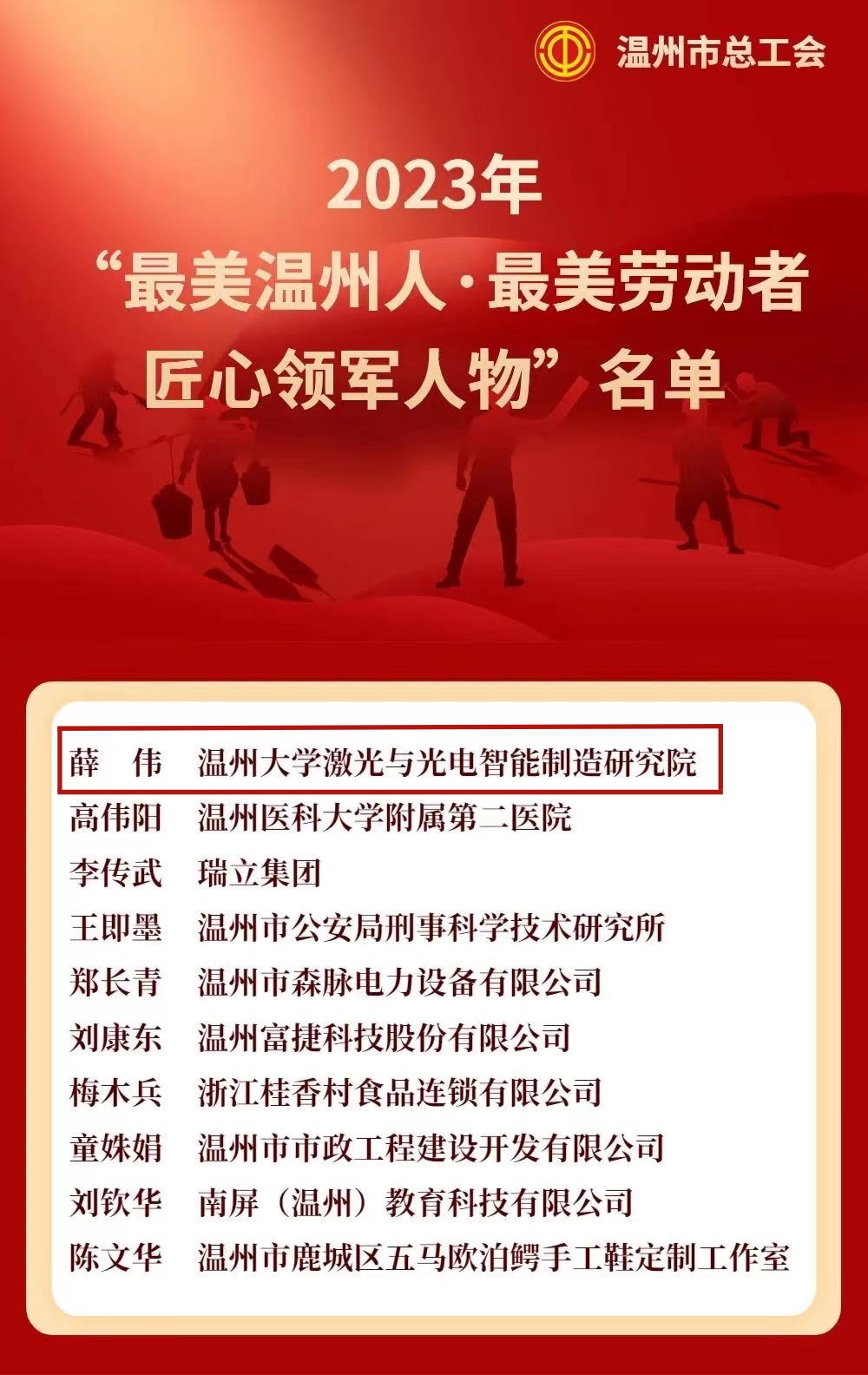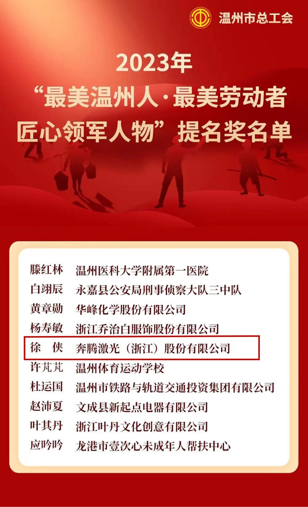 温州市激光行业协会副会长单位温州大学激光与光电智能制造研究院理事长兼首席科学家薛伟教授入选“最美温州人·最美劳动者匠心领军人物”,会长单位奔腾(浙江)股份有限公司轮值CEO徐侠入选“最美温州人·最美劳动者匠心领军人物提名奖”。