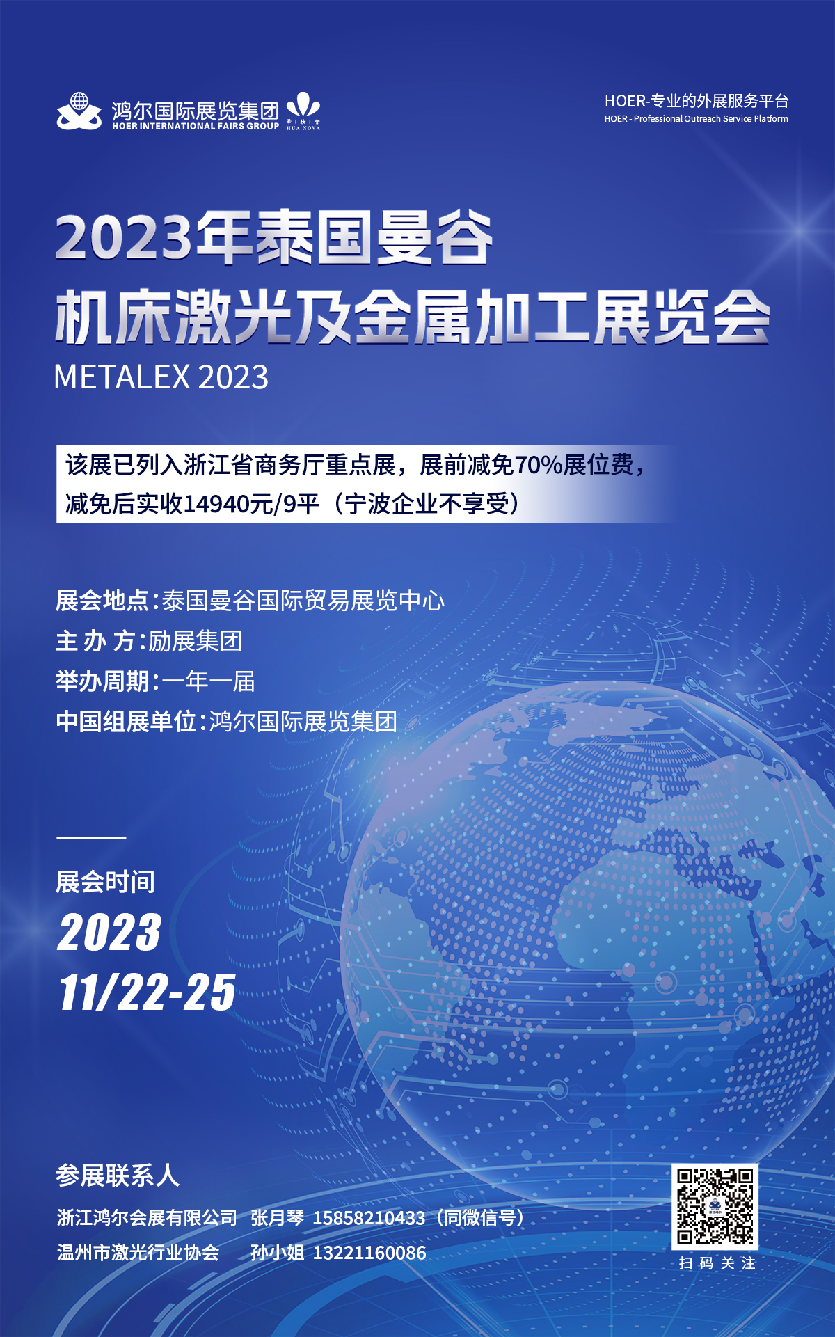 泰国国际机床和金属加工机械展览会 (METALEX) 由励展集团 (REED EXHIBITIONS GROUP)在泰国的展览公司(REED TRADEX CO,LTD.)举办,每年一届。该展是东南亚地区规模、最有影响力的机床及金属加工机械专业性展览会,在泰国乃至整个东南亚地区享有很高的知名度。根据主办方官方信息,第37届泰国国际金属加工展(METALEX)将在2023年11月22-25日在泰国曼谷BITEC国际展览中心举行。展会为期4天,共有7个展馆,3300个国际品牌及国际展馆展示,总面积达45000平米。500家展商及10万名泰国及东盟的买家参加本次展会。