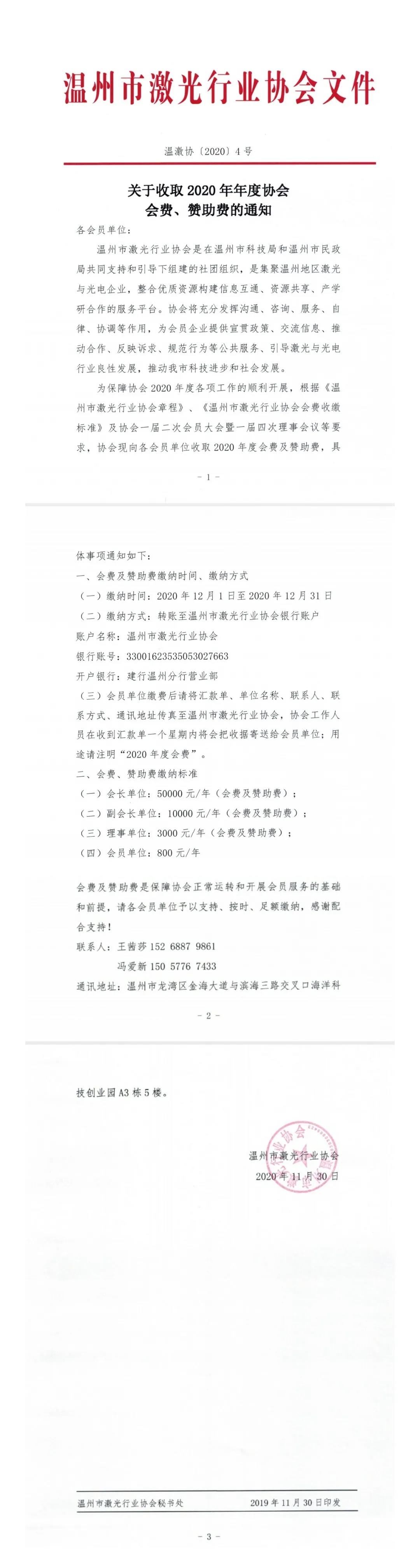 关于收取2020年年度协会会费、赞助费的通知