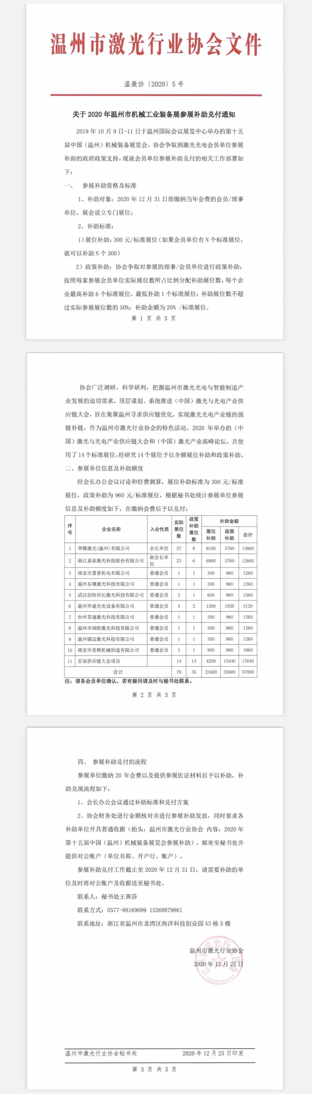 关于2020年温州市机械工业装备展参展补助兑付通知