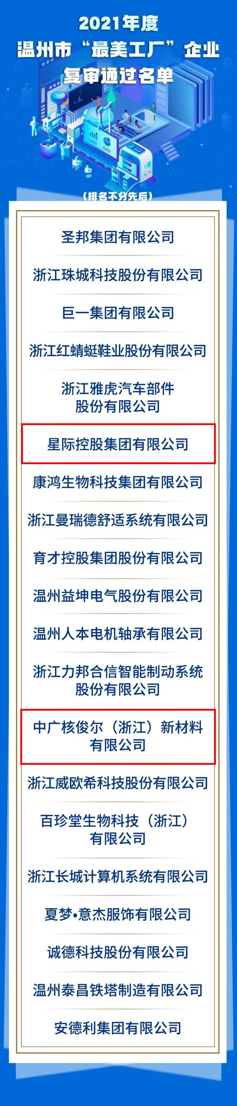 温州市激光行业协会会员单位星际控股集团有限公司、中广核俊尔(浙江)新材料有限公司2家企业通过2021年度温州市“最美工厂”企业复审。